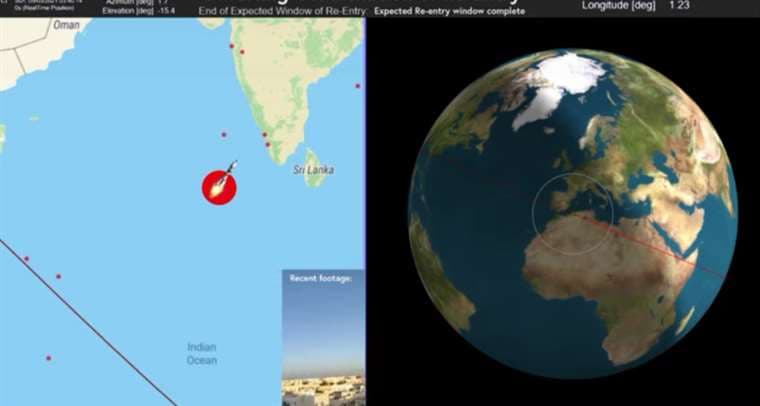 "Según la supervisión y el análisis, a las 10H24 (02H24 GMT) del 9 de mayo de 2021 la primera etapa del cohete portador Larga Marcha 5B ha vuelto a entrar en la atmósfera", informó la Oficina de Ingeniería Espacial china en un comunicado, proporcionando las coordenadas de un punto situado en el Océano Índico cerca de las Maldivas.