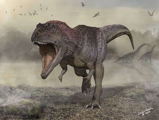 Un grupo de paleontólogos anunció el jueves el descubrimiento de una nueva especie de dinosaurio carnívoro gigante que tenía una cabeza enorme y brazos diminutos, como el Tyrannosaurus rex, y que vivía en la Patagonia argentina.