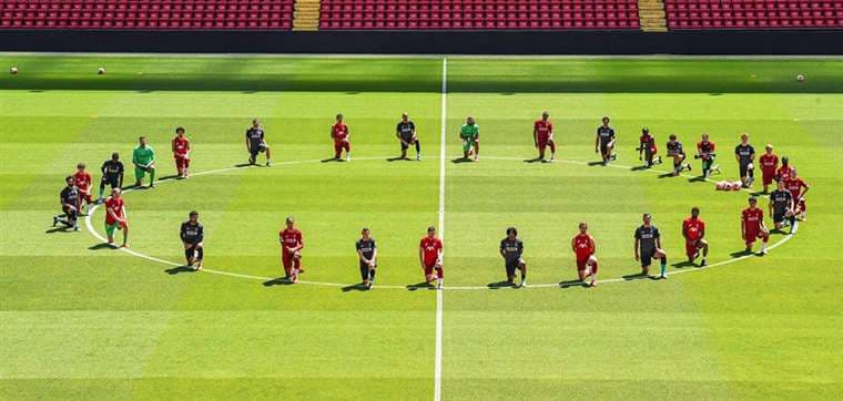El campeón de Europa de fútbol y muy probable próximo ganador de la Premier League, Liverpool FC, mostró este lunes su solidaridad con los manifestantes que reclaman justicia en el caso de la muerte de George Floyd en Estados Unidos, con su plantilla colocando una rodilla en tierra en el círculo central de Anfield.