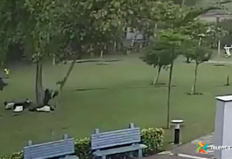 Una cámara de seguridad captó el instante cuando los cuatro hombres se refugian de la lluvia abajo del árbol.