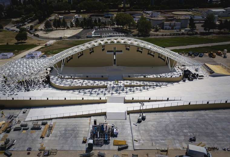 Un poco más arriba, la estructura metálica del altar donde se celebrará el servicio del domingo toma forma en el parque Eduardo VII, que domina los barrios antiguos de la capital bañados por el río Tajo.