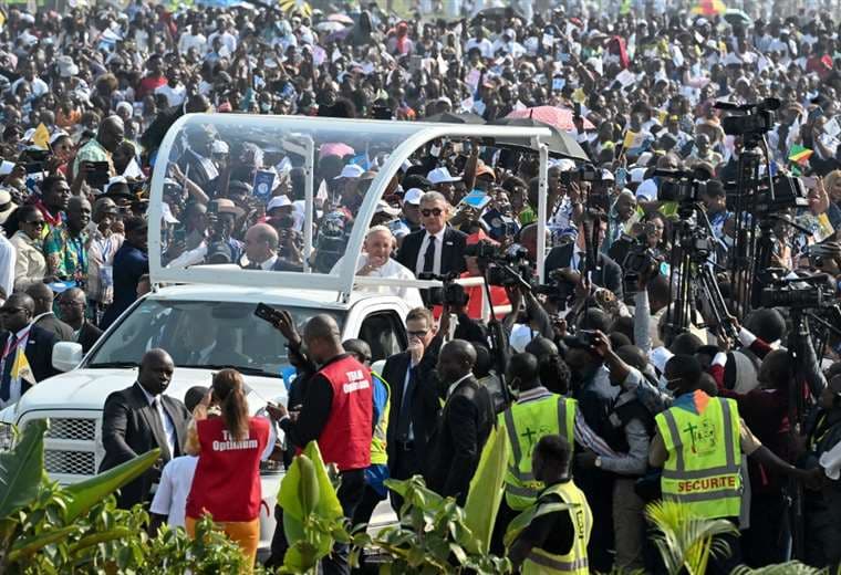 A su llegada al aeropuerto N'dolo de la capital congoleña, donde se organizaba la misa al aire libre, el papa argentino saludó desde su papamóvil a la multitud que lo aclamaba con banderas y cantos tradicionales, en un ambiente festivo pero entre grandes medidas de seguridad.