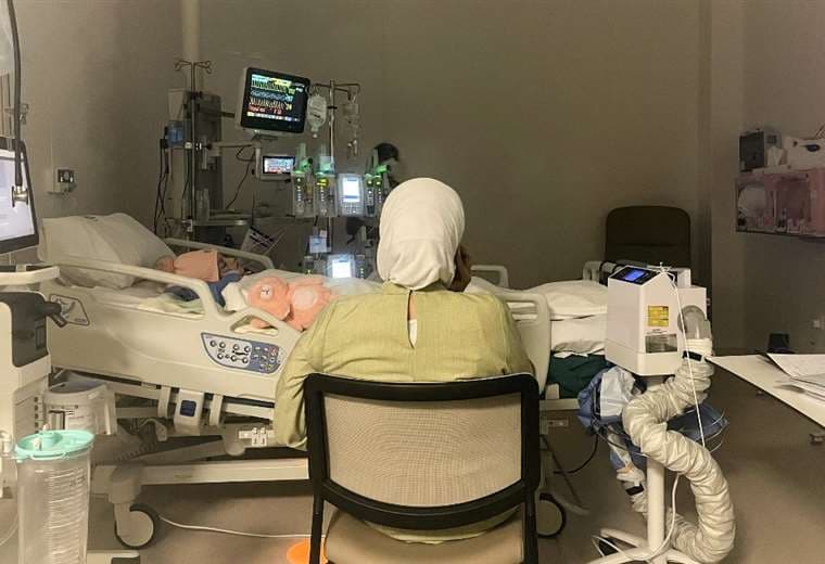 Conectada a monitores y a una perfusión intravenosa, Israa respira con dificultad y apenas habla.