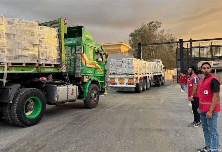 Camiones con ayuda humanitaria comenzaron a entrar desde el cruce egipcio de Rafah hacia los pasos israelíes de Kerem Shalom y Al Auja, desde donde deberían ingresar a la Franja de Gaza, según medios egipcios.