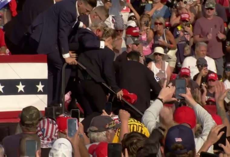 En medio del discurso de Trump, se escucharon disparos. Inmediatamente, el candidato del Partido Repuplicano se tiró al suelo y fue rodeado por su equipo de seguridad. Con sangre visible en una de sus orejas, luego fue evacuado del sitio.