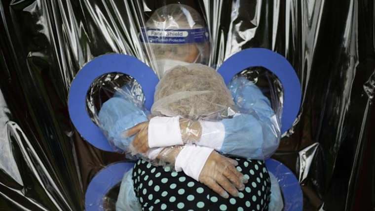 Después de seis meses un grupo de ancianos han vuelto a reencontrarse con sus familiares gracias a una cortina plástica con mangas que facilita un programa de abrazos y evita el contagio de la COVID-19, constató este viernes un periodista de la AFP.