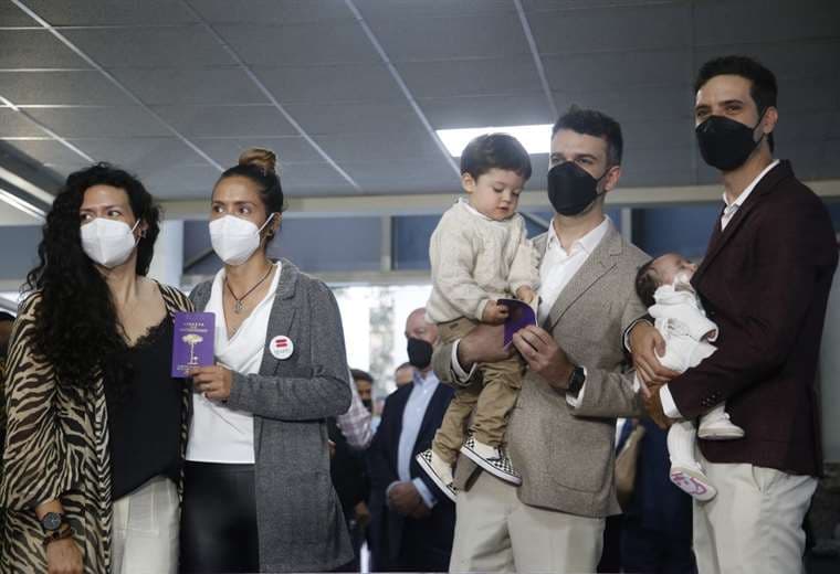 Visiblemente emocionados, a pesar de las mascarillas sanitarias, con sus hijos en brazos, las dos parejas celebraron con familiares y amigos un hecho histórico que rompe con la discriminación de un colectivo que por años ha luchado por la igualdad de derechos en Chile.