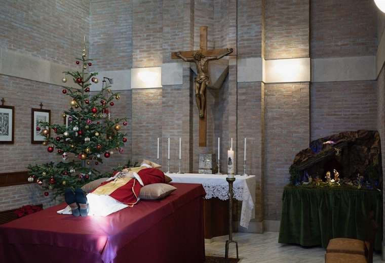 Se trata de un espacio particularmente sobrio, en comparación con los elegantes salones del palacio apostólico, con un crucifijo, un árbol de Navidad y un pesebre.