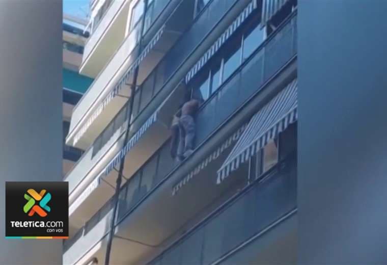 Al escuchar los gritos, un obrero que trabajaba en el piso de al lado, no dudó en arriesgar su vida y deslizarse por la orilla de la pared para rescatarlo.
