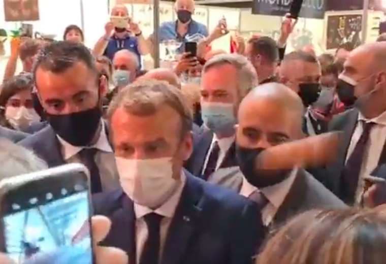 El huevo impactó en la espalda de Emmanuel Macron sin llegar a romperse. El autor del lanzamiento, un estudiante, fue evacuado y esposado.
