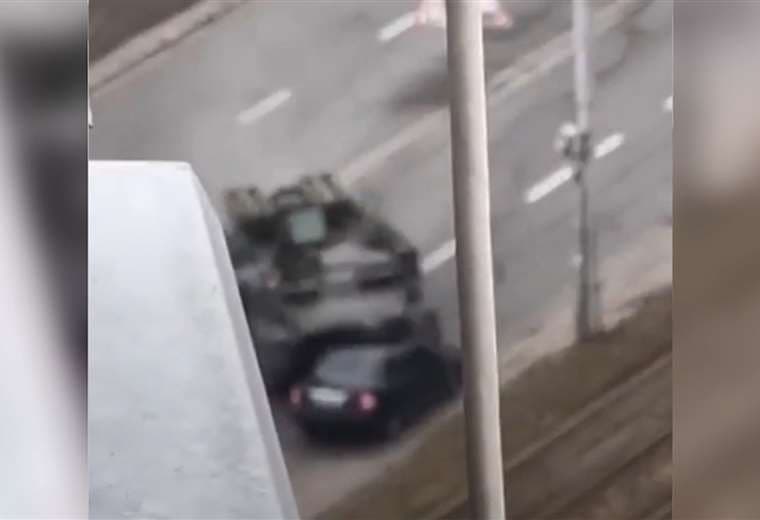 En el video se puede ver como un tanque, que no queda claro a qué bando pertenece, se desvía de su rumbo y aplasta sin piedad un vehículo civil de un adulto mayor que intentaba huir.