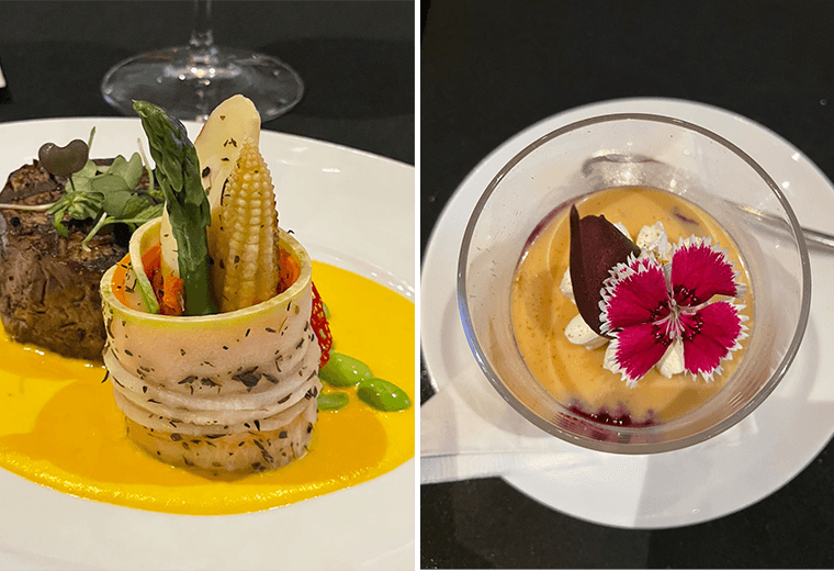 Lomito en salsa de ají peruano: medallón de lomito acompañado de un rollo de vegetales con zucchini, zanahoria, palmito, mini elotes y puntas de espárragos con aceite de albahaca. Acompañado de frijoles verdes salteados con aceite de sésamo.