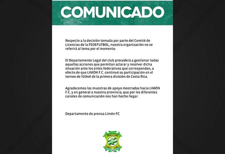 "El Departamento Legal del club procederá a gestionar todas aquellas acciones que permitan aclarar y resolver dicha situación ante los entes federativos que correspondan, a efecto de que Limón FC continúe su participación en el torneo de fútbol de la primera división de Costa Rica", cita el comunicado de prensa.