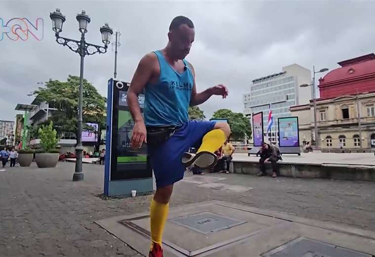 En pleno centro de San José, a lo lejos, se ve a un hombre alto, de piernas largas, con bigote y vestido con un uniforme de fútbol. A primera vista parece imitar los movimientos de las series con un balón invisible. Los transeúntes lo saludan, y él, sin dejar de mover los pies con destreza, les responde con una sonrisa.