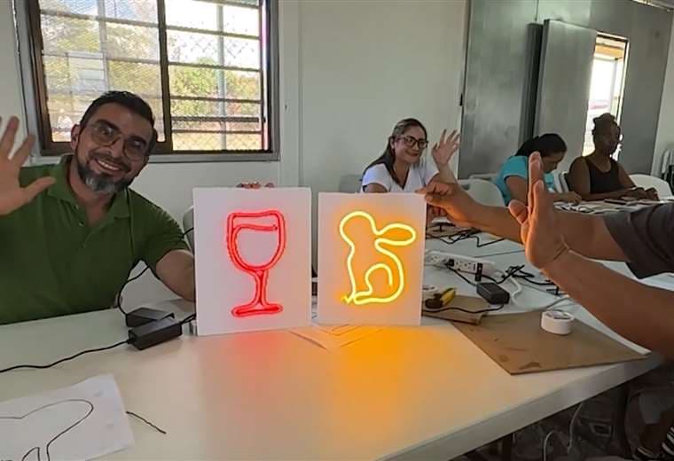 Durante aproximadamente dos horas, los participantes aprendieron a trabajar con los materiales clave: luces LED de Neón Flex, cable UTP, conector hembra, transformador de 12 voltios y pegamento.