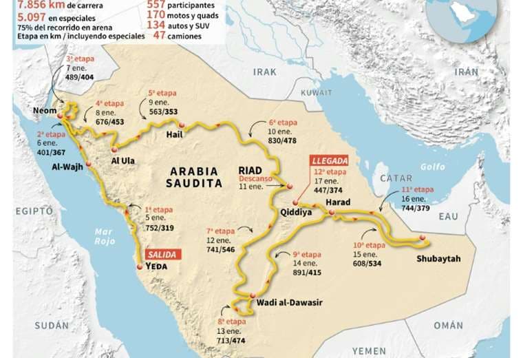 El recorrido, etapa por etapa, de la 42ª edición del Rally Dakar, disputado por primera vez en Arabia Saudita del 5 al 17 de enero: