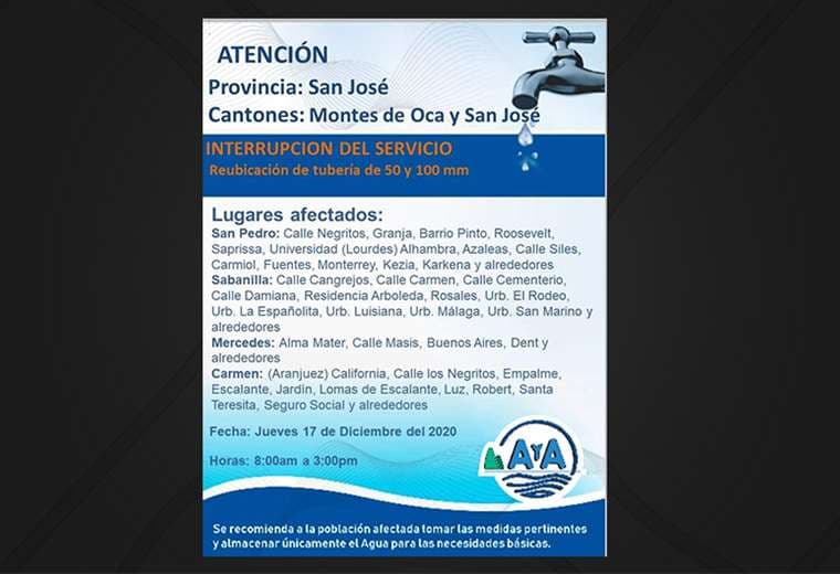 El Instituto Costarricense de Acueductos y Alcantarillados (AyA) comunicó que este jueves 17 de diciembre suspenderá el servicio de agua a poco más de 50.000 vecinos de Montes de Oca y El Carmen, en San José.