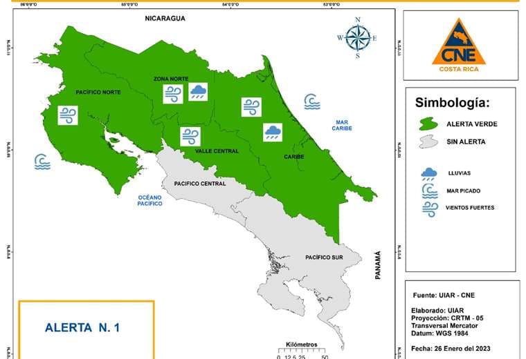 “El empuje frío está generando fuertes ráfagas de viento de hasta 86 kilómetros por hora en el Pacífico Norte, precipitaciones intermitentes en la mayor parte montañosa del Caribe y la Zona Norte. La afectación se mantendrá hasta el domingo”, confirmó Daniel Poleo, meteorólogo del IMN.