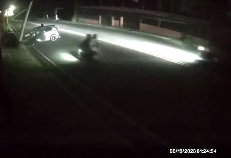 En las imágenes se observa cómo, antes del accidente, pasan tres motocicletas a alta velocidad. Segundos después, en sentido contrario, el carro pierde el control y colisiona de frente contra el poste.