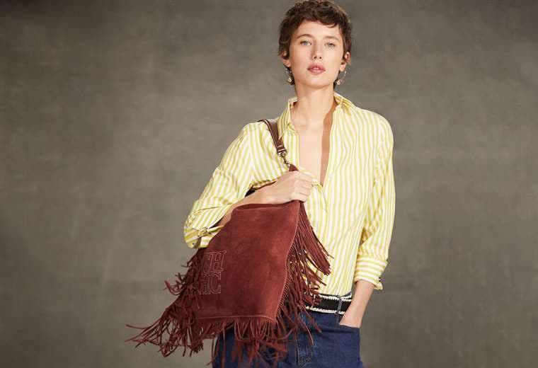 El bolso forma parte de la colección “Poncho”, hecho de lino con diseño de rayas y las iniciales CH, además tiene flecos abajo y una correa para transportar como bolso de hombro.