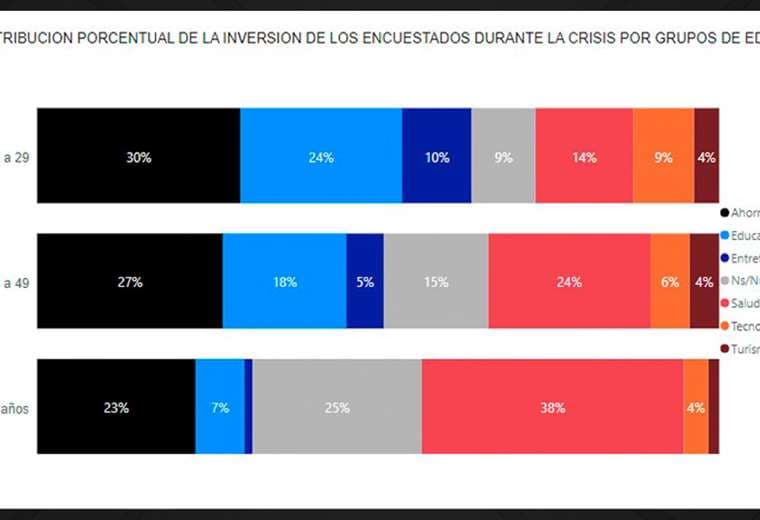 Al cruzarse los datos, la encuesta revela que quienes más ahorraron durante la pandemia son las personas entre los 18 y 29 años. Esta misma población es la que más invirtió en educación. El sector que más invirtió en salud es la población con más de 50 años.