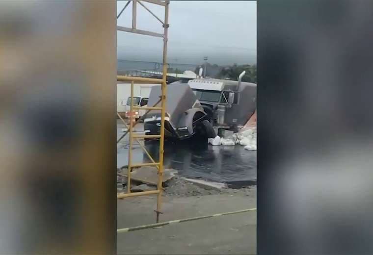 El conductor de un tráiler protagonizó un inusual accidente de tránsito, la madrugada de este jueves. Subió por una rampa en construcción y cayó sobre obras del paso a desnivel en La Lima de Cartago.