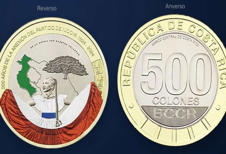 Por un lado, tiene la denominación 500 colones. Y por el otro el verde del territorio del Partido de Nicoya, el árbol de Guanacaste y una mujer con el traje típico.