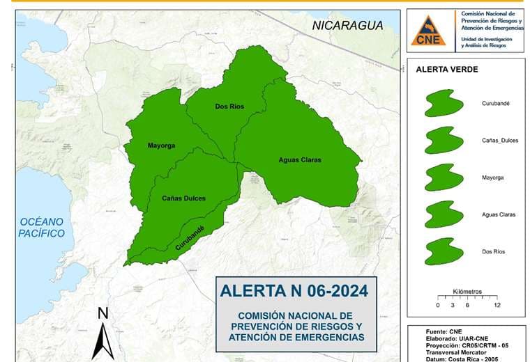En Upala, los distritos con alerta verde son Dos Ríos y Aguas Claras, mientras que en Liberia abarca a Cañas Dulces, Curubandé y Mayorga.