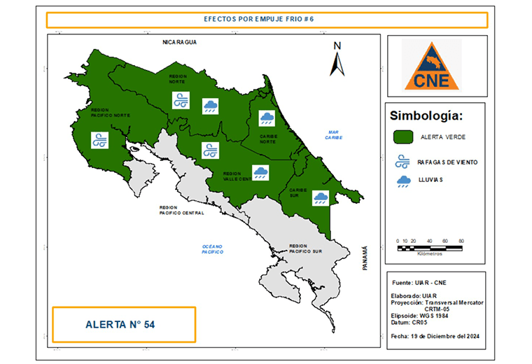 "Según el IMN, se espera que el empuje frío llegue a nuestro país de lleno en la tarde/noche del jueves 19 de diciembre y se mantenga su influencia al menos hasta el lunes. Las ráfagas en el Pacífico Norte, Valle Central y las cordilleras serán fuertes", explicó la CNE a través de un comunicado de prensa.