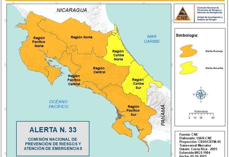 “La CNE está elevando el estado de alerta a naranja para todo el territorio nacional, excepto para la región Caribe, que se mantendrá en alerta amarilla. Esto debido a que el Instituto Meteorológico Nacional, en su último reporte, nos ha informado que la zona de convergencia intertropical se mantendrá activa. Además, se prevé el paso de la onda tropical número 35 durante la tarde y la noche, lo que podría acrecentar la cantidad de emergencias”, indicó Picado.