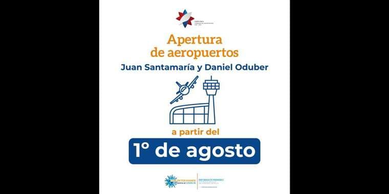 “Se ha solicitado respetuosamente la apertura de los tres aeropuertos internacionales: Juan Santamaría, Daniel Oduber y Tobías Bolaños, tanto para vuelos con itinerarios establecidos como privados a partir del 1 de julio de 2020, de forma escalonada, controlada y paulatina, comenzando por aquellos vuelos desde la Unión Europea y el Reino Unido, para ciudadanos y residentes de esa región; continuando con los de Canadá”, informó el ICT.