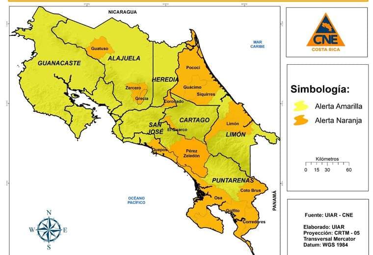 En total, el país mantiene 18 cantones en alerta naranja y 64 en alerta amarilla. Puntarenas (5), Alajuela (5) y Limón (4) son las provincias con más zonas en alerta naranja, por lo que las autoridades piden elevar las medidas de control.