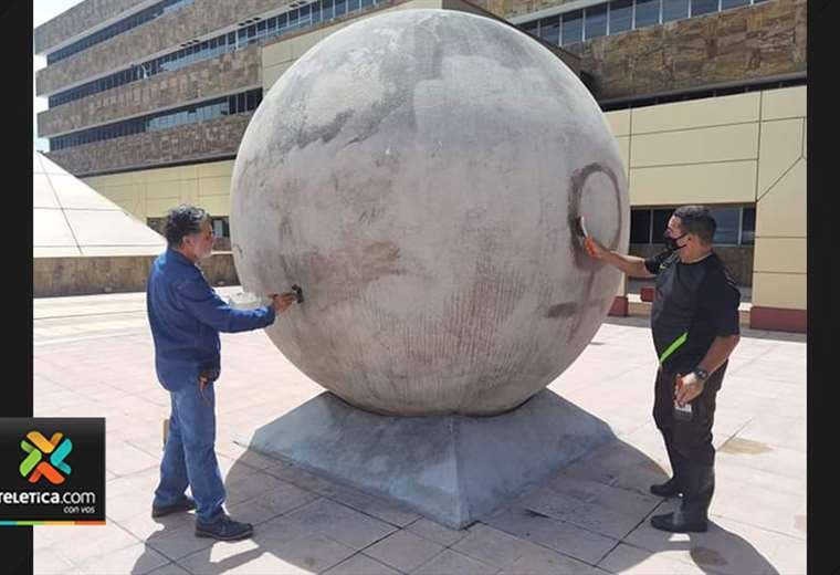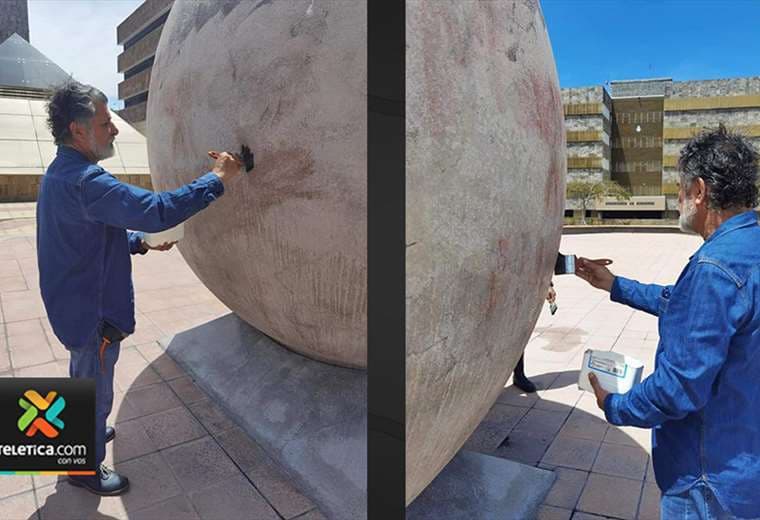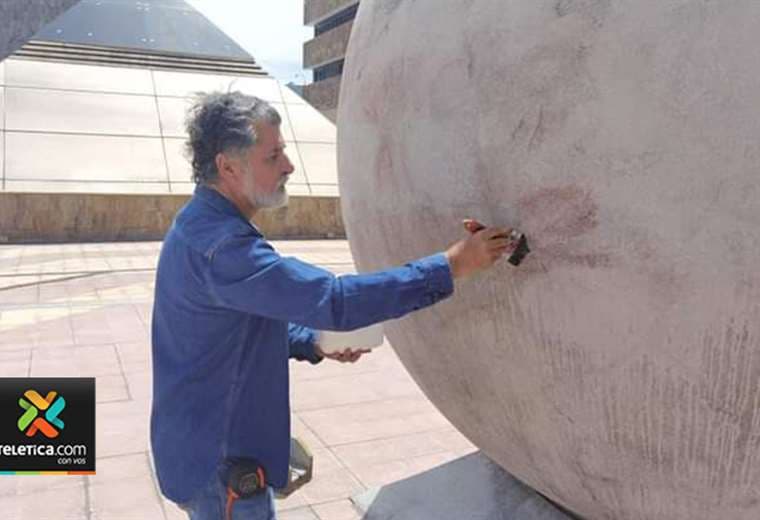 Don Ibo Bonilla, creador de las esferas precolombinas en la Plaza de la Justicia, llegó a limpiar los rayones que les hicieron este lunes.