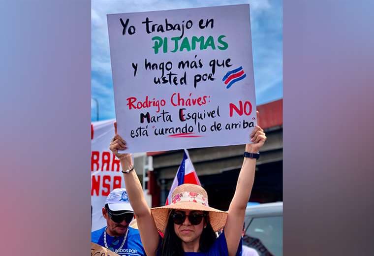 "El que no brinca es Chaves" fue otra de las frases que pronunciaban los manifestantes durante su recorrido por la capital. Sumado a esto, se pudieron observar pancartas como la de Undeca, con la leyenda “La Caja no está quebrada, Chaves la quiere quebrar. Unámonos en su defensa” o "Yo trabajo en pijamas, y hago más que usted por Costa Rica".