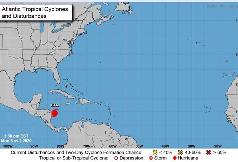 El Centro Nacional de Huracanes de los Estados Unidos informó, minutos antes de las tres de la tarde de este lunes, que el huracán Eta alcanzó la categoría 4.