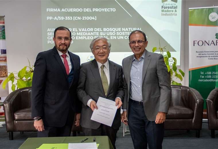 Shinjiro Komatsu, embajador Extraordinario y Plenipotenciario de Japón en Costa Rica, Franz Tattenbach Capra, ministro de Ambiente y Energía en Costa Rica y Jaime Sotela Montero, presidente de la Cámara Forestal Madera e Industria, junto con representantes del sector público, privado y de la sociedad civil, se reunieron el pasado jueves en el Colegio de Ingenieros Agrónomos (CIAGRO) para firmar el documento del proyecto.