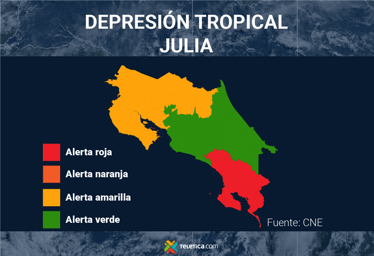Julia se degradó a depresión tropical durante la mañana de este lunes, lo que motivó a las autoridades a cambiar el nivel de alertas en Costa Rica.