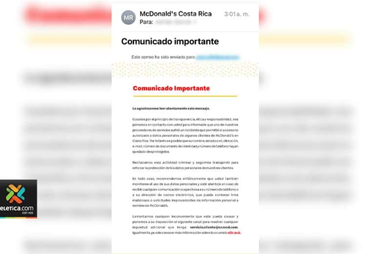 “Guiados por el principio de transparencia, ética y responsabilidad, nos ponemos en contacto con usted para informarle que uno de nuestros proveedores de servicios sufrió un incidente que permitió el acceso no autorizado a datos personales de algunos clientes de McDonald's en Costa Rica. Por lo tanto, es posible que su nombre, estado civil, dirección, e-mail, número de documento de identidad y número de teléfono hayan quedado desprotegidos”, señala el comunicado.