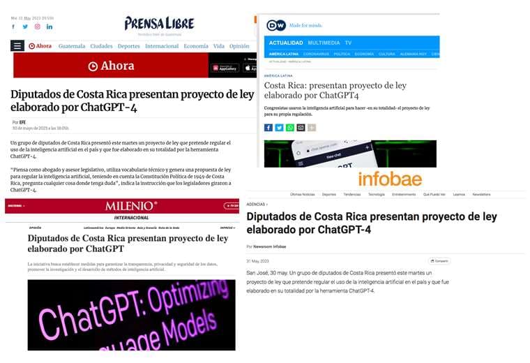 “Diputados de Costa Rica presentan proyecto de ley elaborado por ChatGPT-4”, titula el argentino Infobae, mientras que el mexicano TV Azteca escribió “En Costa Rica presentan iniciativa de ley elaborada por inteligencia artificial”.