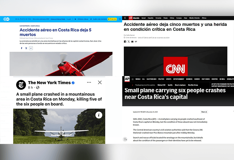 Por su parte, AP tituló: “Avioneta que transportaba a seis personas se estrella cerca de la capital de Costa Rica”.