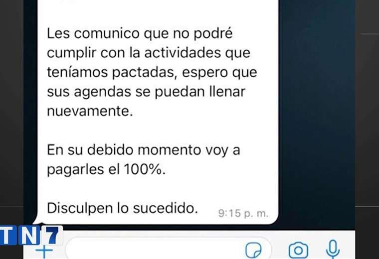 “Les comunico que no podré cumplir con las actividades que teníamos pactadas, espero que sus agendas se puedan llenar nuevamente. En su debido momento voy a pagarles el 100%. Disculpen lo sucedido”, dice la comunicación.