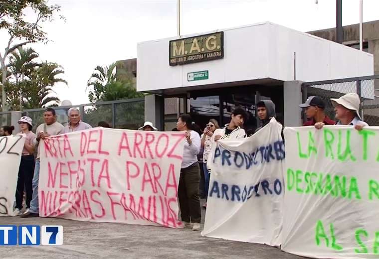Productores de arroz de diferentes partes del país se manifiestan esta mañana en las afueras del Ministerio de Agricultura y Ganadería (MAG).