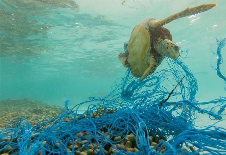 Estas artes de pesca incluyen las redes desechadas, perdidas o abandonadas en el mar que continúan pescando y atrapando animales, así como enredando y potencialmente matando a la vida marina.