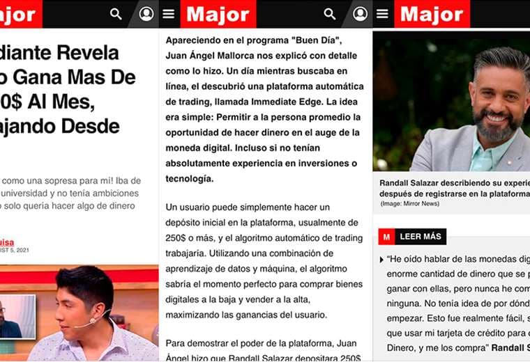 La información engañosa se divulga tanto es un sitio web como en un video de YouTube. La publicación indica que un supuesto estudiante, identificado como Juan Ángel Mallorca, se ganó $40.000 mensuales trabajando desde casa en una "plataforma automática de trading".