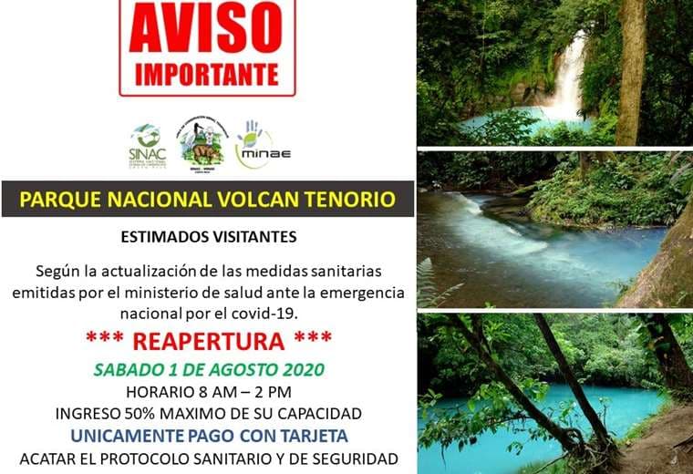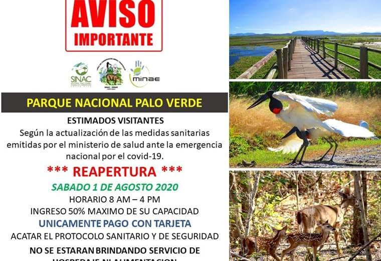 Los Parques Nacionales abrirán con un 50% de su capacidad. Para este 1° de agosto, se suman el Parque Nacional Palo Verde y el Parque Nacional Tenorio, además de la lista ya autorizada por el Ministerio de Ambiente y Energía (MINAE).