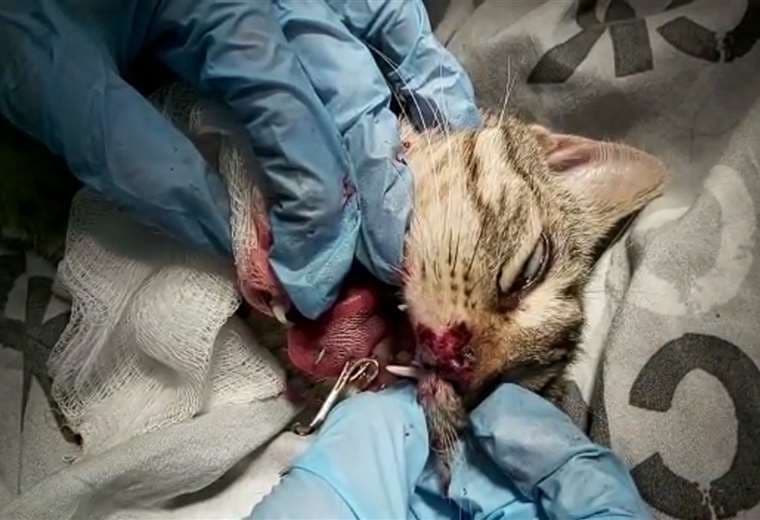 El gato, de aproximadamente un año, fue operado de emergencia para extraerle los anzuelos. Presentó serios problemas respiratorios antes de ingresar al quirófano.