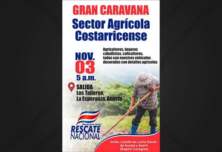 Este sábado 31 de octubre, convocan a una gran caravana vehicular. Saldrán a las 8 a. m. del Parque de San Ramón, recorrerán Palmares, Naranjo, Sarchí y Grecia rumbo al Parque del Agricultor en Alajuela.