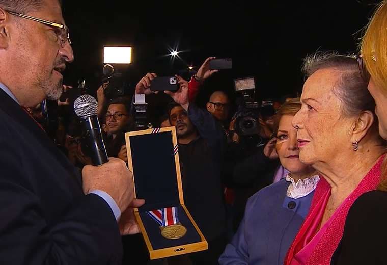 “Para mí es un honor presentarle y entregarle esta medalla, la cual no lleva un comité de selección, es la decisión única, exclusiva, del Presidente de la República y se la doy por una razón: usted, como mujer, junto a su marido, crearon el primer pilar de democracia, que fue el primer medio televisivo. Un país cuya libertad de prensa, la libertad de alabar y criticar es parte de nuestro ADN. Usted como persona merece el honor de esta medalla, muchas gracias a nombre de los costarricenses y que Dios la bendiga siempre”, le dijo Chaves.