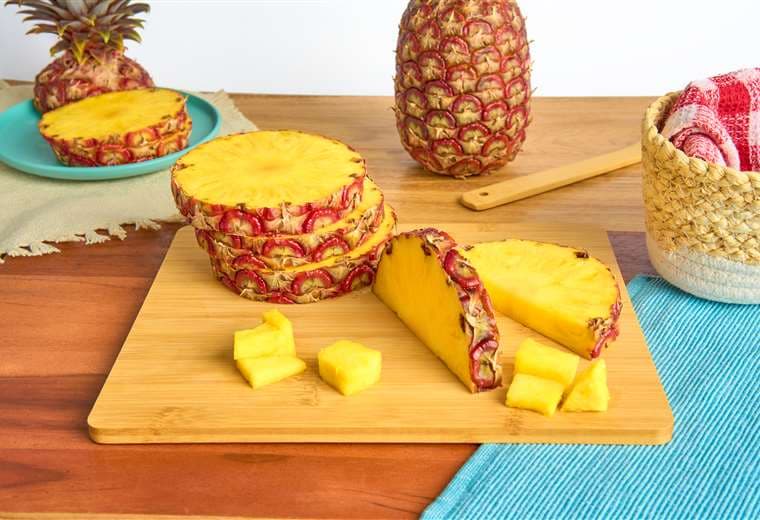 En este caso, la fruta tiene cáscara roja y una pulpa amarilla brillante, con un sabor dulce similar a las piñas que ya vende Del Monte.