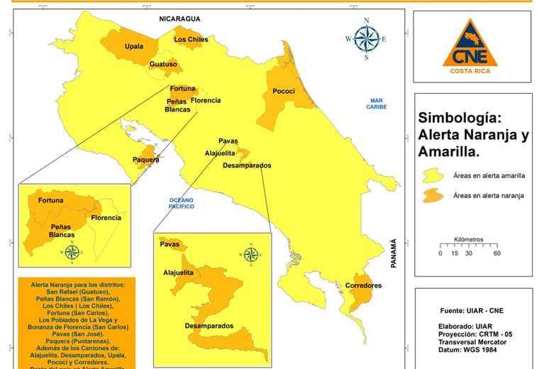 Además, de estos lugares se encuentran en alerta naranja Pavas, Pococí, Peñas Blancas de San Ramón, Los Chiles, La Fortuna, Upala, Paquera, Alajuelita, Desamparados, Corredores, La Vega y Bonanza.